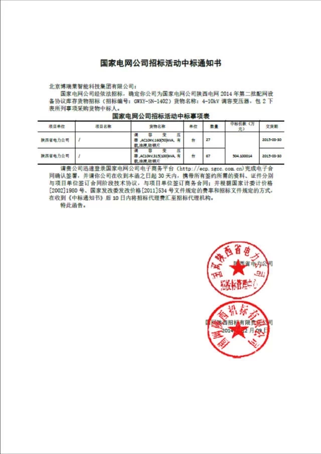 2014年12月9日,我公司中标国家电网公司陕西电网2014年第二批配网设备协议库存货物招标 (调容变压器)94台504.1万元。